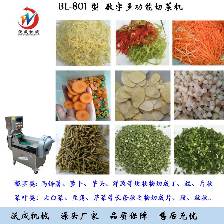 BL-801型双头切多功能切菜机具备双调频功能,一头是切叶菜类,如长葱,蒜苗,韭菜,芹菜,白菜,青菜等等,一头是切球根茎类,如萝卜,土豆,红薯,芋头,笋,洋葱,茄子,苹果,生姜等等众多瓜果类蔬菜。可切片(厚薄度可订做),切丝(粗细度可订做),切段切条(长短度可调),切丁(大小粒可订做)。